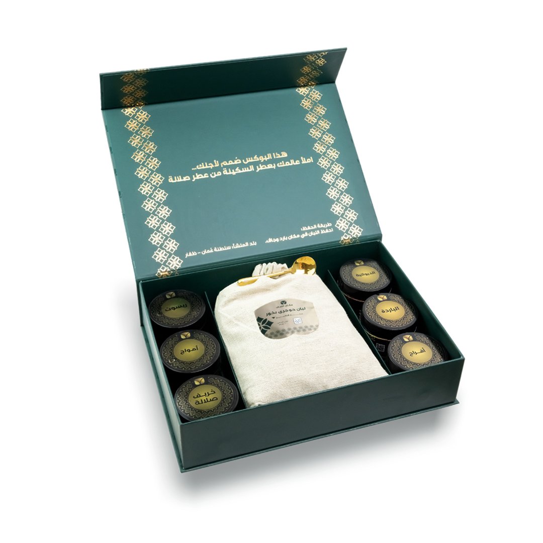 تضم كذلك (6 عبوات) متنوعة من أنواع الدخون الفاخر بروائح متنوعة تلائم جميع الأذواق والمناسبات،