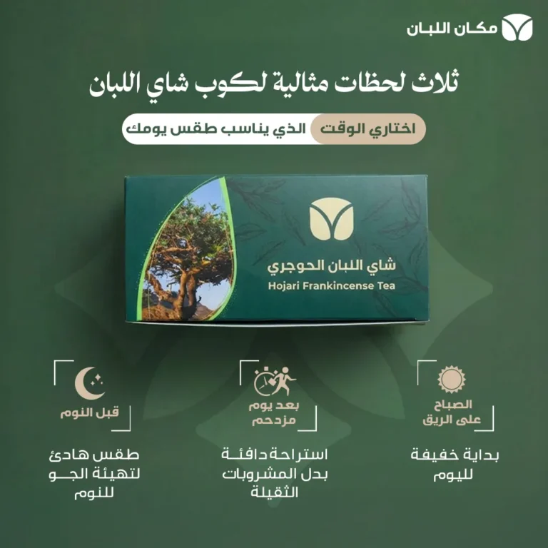 •   قبل النوم : شاي اللبان الحوجري العُماني كجزء من روتين هادئ يساعد على تهيئة الجو للنوم العميق.